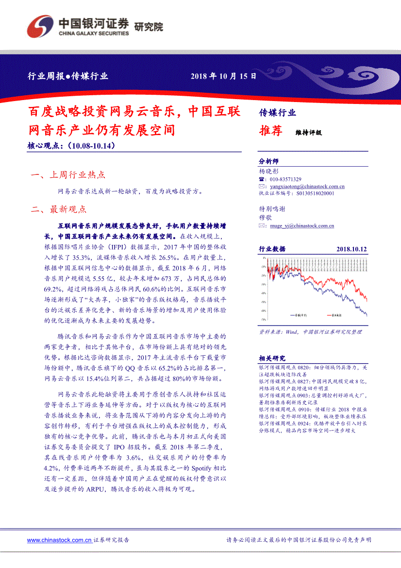 分析师杨晓彤 ★✿:执业证书编号★✿:S01 特别鸣谢穆歌★✿:.cn 行业数据 2018.10.12 资料来源★✿:Wind★✿,中国银河证券研究院整理相关研究银河传媒周观点0820★✿:细分领域仍具潜力★✿,关注超跌板块边际改善银河传媒周观点0827★✿:中国网民规模突破8亿★✿,网络游戏用户数增速回升明显银河传媒周观点0903★✿:总量调控利好游戏大厂★✿,暑期档票房刷新历史记录银河传媒周观点0910★✿:传媒行业2018中报业绩总结★✿:受外部环境影响★✿,板块整体业绩承压银河传媒周观点0924★✿:优酷开放平台引入时长分账模式★✿,精品内容市场空间一进步增大行业周报/传媒行业★✿。